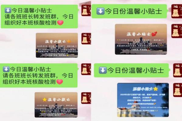 雷打不动,早上六点的温阳准时把我唤醒。充实的一天将要开始。洗漱、吃饭、早读,将生活嚼得有滋有味,把日子过得活色生香,往往靠的不只是嘴,还要有一颗浸透人间烟火的心啊,“哦,快8:30了,做核酸的时间到了。”马不停蹄,直赶宿舍,“@所有人,出来啦,出来啦,出来做核酸啦,带好口罩,间隔一米,左扫码,右检测”“都穿厚点哦”。当班群里的接龙到第28人时,我明白,今天的核酸任务已然完成。