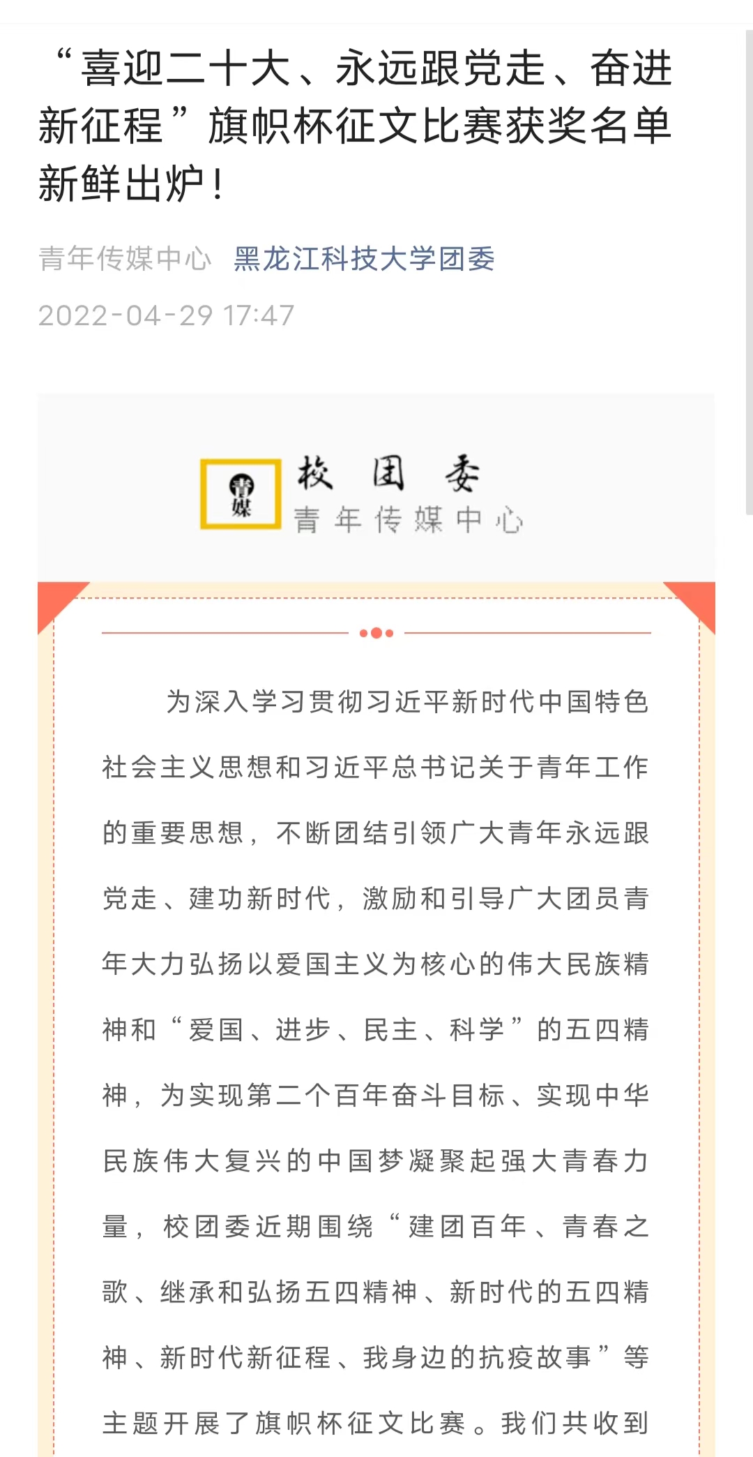 五四前夕,全校各级团组织充分发挥共青团组织优势,共征集了电子与信息工程学院《那年那兔那些事儿》、管理学院《共唱共青团歌、回望百年团史》、机械工程学院《向警予的故事》、建筑工程学院《DREAM》、经济学院《天天向上》在内的短视频、海报漫画、原创歌曲等文化作品500余份,充分展示了祖国建设的伟大成就和广大青年不畏艰险、勇挑重担、积极向上、奋发有为的精神面貌;校团委组织开展“旗帜杯”征文比赛,共征集优秀作品200余篇,引领广大团员青年围绕继承和发扬五四精神、建团百年、新时代新征程、我身边的抗疫故事等主题,抒发对祖国的热爱和青春的热血激情,弘扬主旋律,传播正能量。
