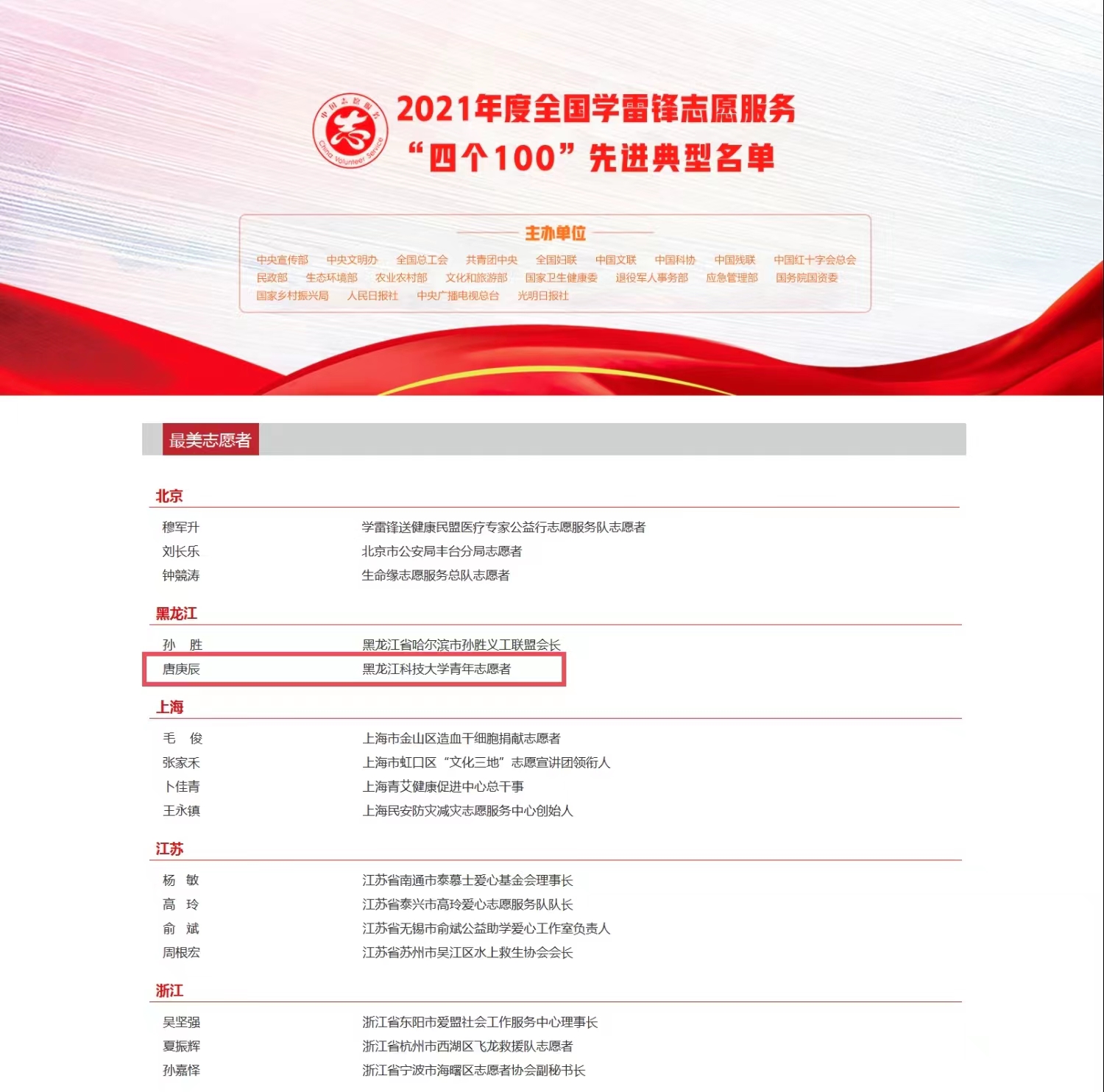 近日,中央宣传部、中央文明办、全国总工会、共青团中央等部门和单位共同组织开展的2021年度全国学雷锋志愿服务“四个100”先进典型宣传推选活动中,【官网】唐庚辰同学被授予“最美志愿者”荣誉称号。唐庚辰同学是本次被表彰的全国100名“最美志愿者”中唯一一名高校本科生,是迄今为止【官网】青年志愿者所获得的最高荣誉。