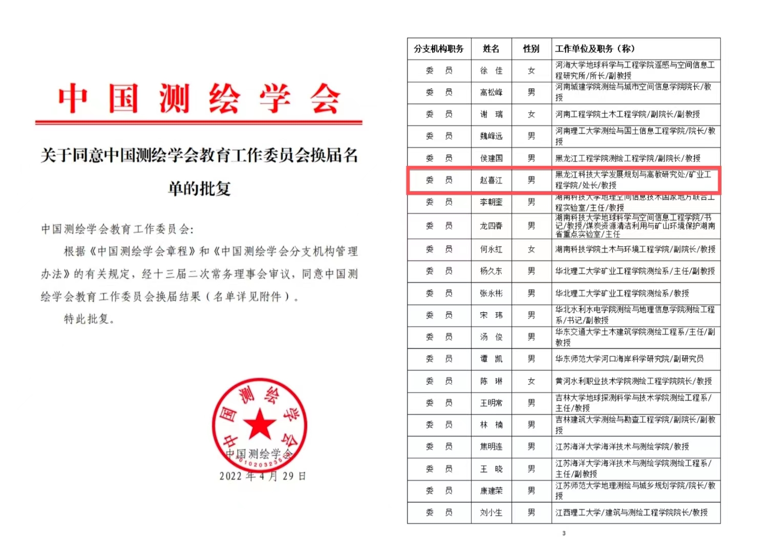 赵喜江教授当选中国测绘学会教育工作委员会委员,将会对【官网】测绘工程学科专业建设、教育教学改革和教学质量提升起到积极的推动作用。
