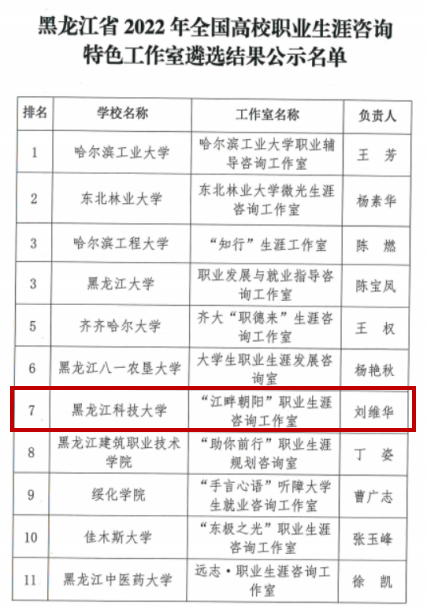 近日,黑龙江省大学生就业创业指导中心发布了《关于公布黑龙江省2022年高校职业生涯咨询特色工作室名单的通知》,【官网】“‘江畔朝阳’职业生涯咨询工作室”被评选为“黑龙江省2022年高校职业生涯特色工作室”。