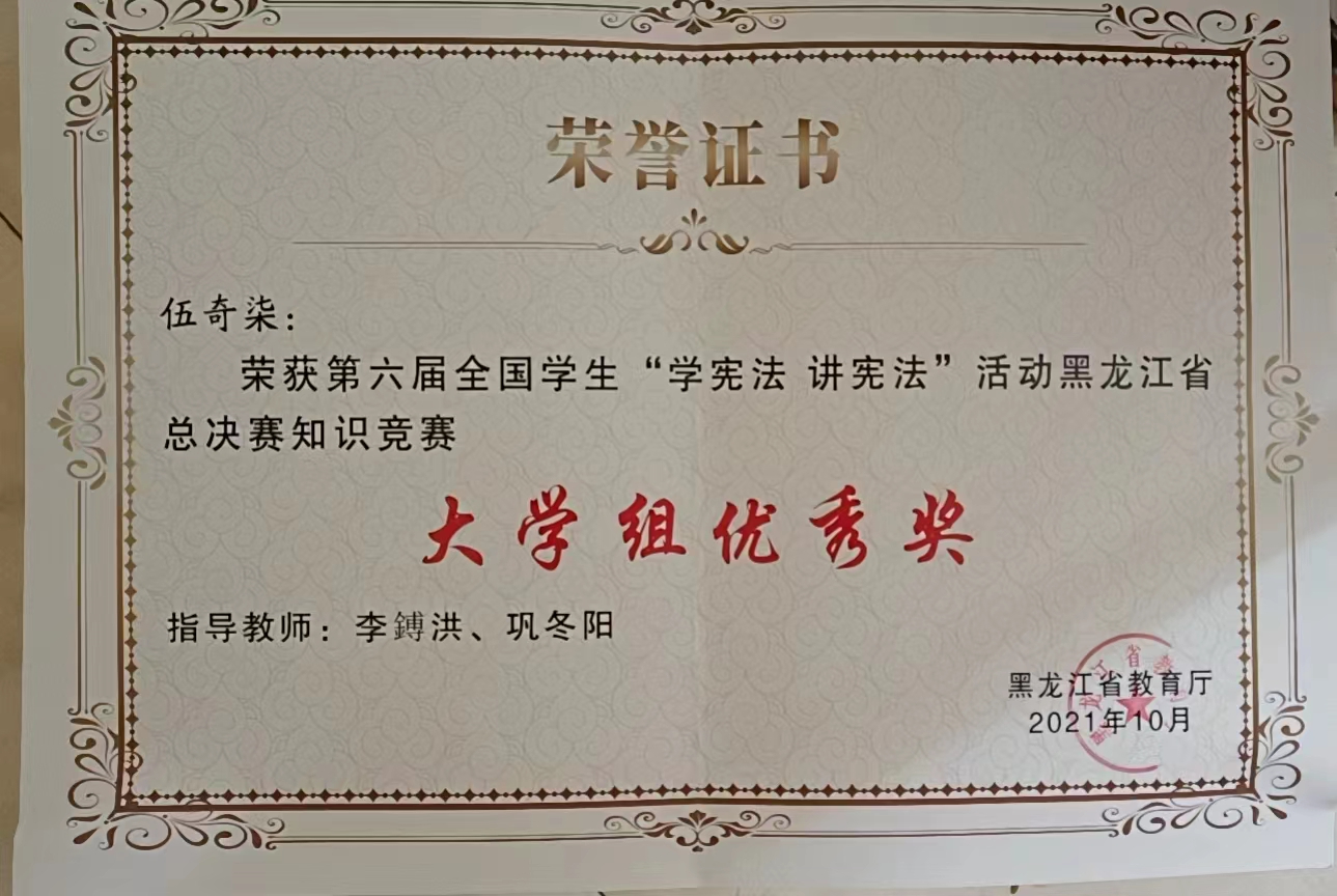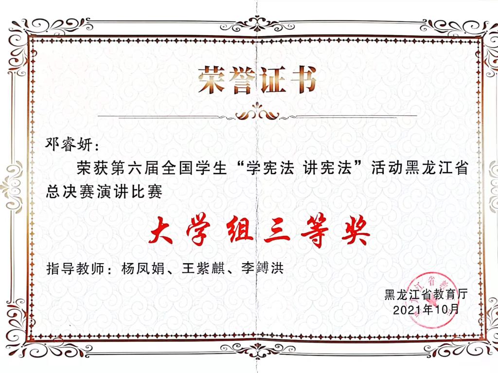 在全省“学宪法讲宪法”演讲比赛中,邓睿妍经过激励的角逐,成功晋级全省第二轮决赛。在决赛的命题演讲中,她结合自身专业的真实案例,通过新颖的角度和生动的语言讲述了“学宪法,讲宪法”的重要性,以极富感染力的表现形式和出色的临场应变得到了认可,最终以优异的成绩获得了黑龙江省总决赛演讲比赛大学组三等奖。在“学宪法讲宪法”知识竞赛活动中,伍奇柒也是经过了学院初赛、学校决赛选拔赛,并以全校第一的优异成绩代表学校参加省级比赛,并最终获得全省“学宪法 讲宪法”获得黑龙江省总决赛知识竞赛大学组优秀奖。