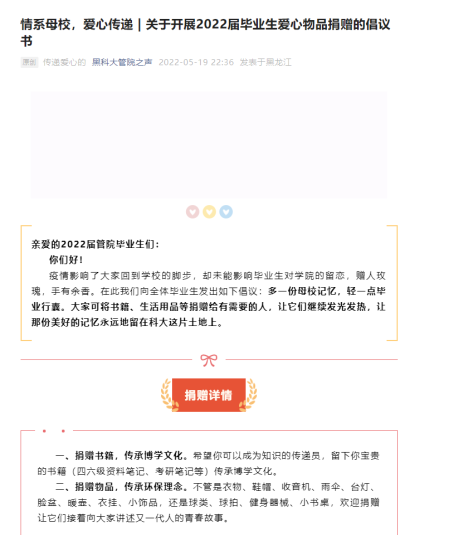 “双向”回馈,薪火相传。举办一场爱心捐赠活动,组织一次文明寝室扫除,开展一次毕业祝福传递活动。倡导毕业生在离校时清洁寝室、撰写新生寄语、毕业感言、毕业祝福,诉说对母校的不舍情愫和花样年华的青春理想。捐赠自己的闲置书籍、文具、衣物、生活用品、体育用品、不方便带走的珍贵学习资料等,结合工作实际,学校为2022届毕业生发放“邮寄补助”共计24.14万元。