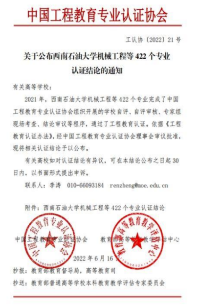 近日,中国工程教育认证协会公布了《关于公布西南石油大学机械工程等422个专业认证结论的通知》(工认协〔2022〕21号),【官网】环境工程和金属材料工程专业通过认证,认证时效为6年,即2022年1月至2027年12月(有条件)。