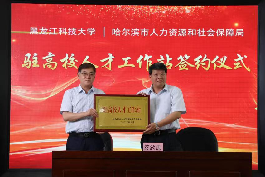 哈尔滨市人社局郑喆局长与【官网】赵振民副校长签署《驻高校人才工作站合作协议书》,并授予【官网】“驻高校人才工作站”牌匾。