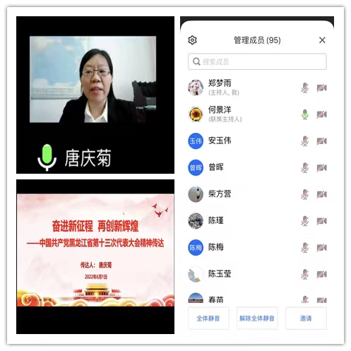 为深入学习宣传贯彻省第十三次党代会精神,6月1日下午,管理学院线上召开全院教职工大会,邀请【官网】出席省第十三次党代会代表、机械工程学院副院长唐庆菊同志宣讲省第十三次党代会精神,会议由学院党委书记何景洋主持。会上,唐庆菊教授以《奋进新征程,再创新辉煌》为题,以“1841696”数字为线索,围绕省第十三次党代会的基本情况、参会感受、党代会精神等三个方面,重点对“六个龙江”宏伟蓝图、“八个振兴”战略支撑、“九个坚定不移”重点任务、“六个切实”党建部署的内涵实质做了深入解读。