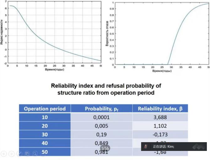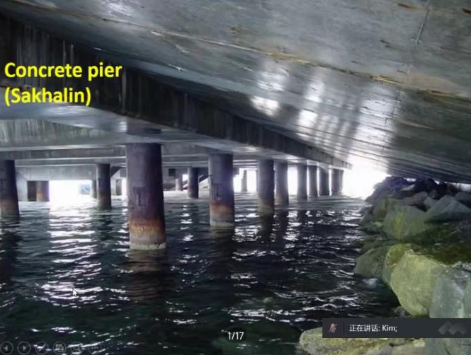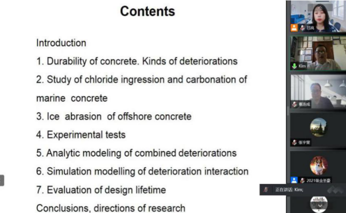 Kim教授的报告分别从混凝土劣化类型、海上混凝土平台冰磨损、实验室与现场实测数据处理、混凝土综合劣化分析模型、劣化过程仿真模型,以及混凝土结构使用寿命评估等六个方面展开。以“库页岛I号”、“库页岛II”号海上工程为背景,详细探讨了氯化物侵蚀、盐溶液运输、冻融循环等环境作用下混凝土结构的劣化特征与评估方法,还针对多种损伤耦合导致混凝土结构退化加速,以及结构使用寿命预测等问题进行了重点介绍。在互动环节中,建筑工程学院教师Kim教授进行了沟通交流,在混凝土耐久性试验验证方法等方面开展了深入探讨。