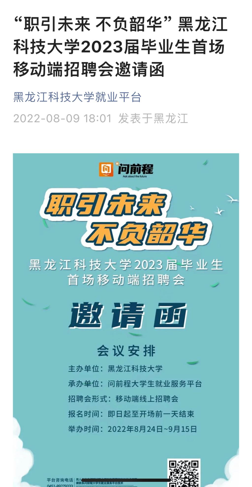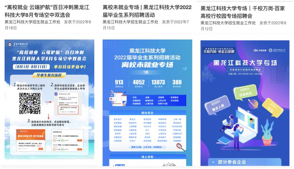 五是访企拓岗不停歇。学校利用假期全力开展访企拓岗,不断扩大毕业生招聘“朋友圈”, 稳住岗位供给“基本盘”。校党委副书记桑玉军参加了黑龙江省“民企高校携手促就业行动”启动会,代表学校签署校企合作促就业协议;招就处处长高志刚赴佳木斯市、建三江、抚远市开展访企拓岗暨“高校东极行”活动,并与抚远市签订共建人才工作站;招就处副处长刘维华赴台州市参加“智汇台州”人才招聘周系列活动,与台州市签订战略合作协议,参加了哈尔滨人力资源服务产业园揭牌仪式等活动。各学院结合本单位专业特点积极开展了省内访企拓岗。