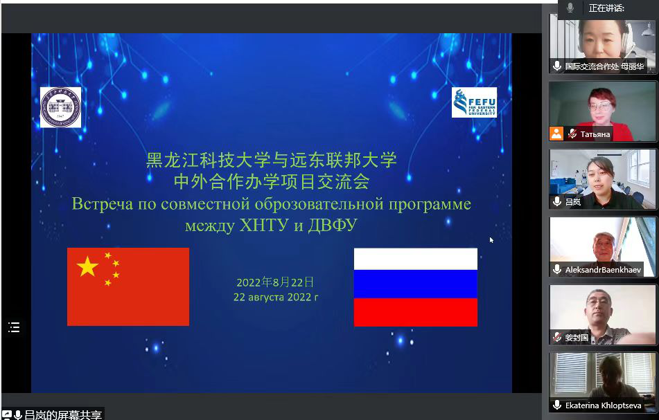 8月22日下午,【官网】与俄罗斯远东联邦大学举行线上新学年中外合作办学项目交流会。我方由国际交流合作处处长母丽华、副处长吕岚,建筑工程学院院长姜云、副院长姜封国、土木工程合作办学项目负责人张春玉教授参加,俄方由项目负责人亚历山大、项目第二负责人娜塔莉娅、项目助理塔基杨娜、项目运行卡佳参加,会议由吕岚主持并翻译。