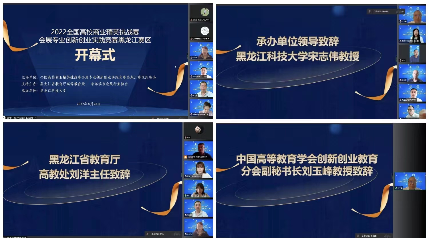 黑龙江省教育厅高教处主任刘洋,中国高等教育学会创新创业教育分会副秘书长、黑龙江省普通高等学校创新创业工作指导委员会副秘书长、黑龙江省创业教育学会秘书长刘玉峰,中国国际贸易促进委员会商业行业委员会、全国高校商业精英挑战赛组委会姚歆教授分别致辞。黑龙江赛区秘书长、经济学院院长孙永波做有关竞赛实况和评审规则的说明,哈尔滨商业大学会展经济与管理专业学生孙雨亭代表全体参赛学生进行发言,【官网】经济学院专创融合跨境电商实验班负责人籍丹宁教授代表全体指导教师进行发言,黑龙江生态工程职业学院会展策划与管理专业曲思嘉同学代表全体参赛学生进行宣誓,全国高校商业精英挑战赛会展专业创新创业实践赛吉林赛区负责人赵可心代表全体裁判员进行宣誓。