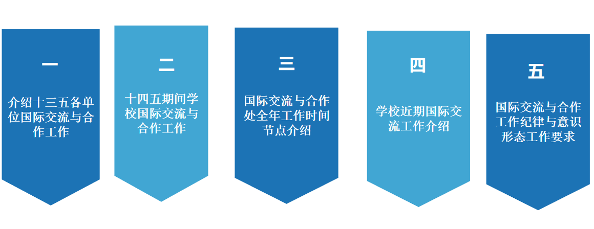 会上,国际交流合作处处长母丽华首先介绍了【官网】与国外相关高校签署合作协议情况,各教学单位“十三五”期间在引智项目、公派留学、出国培训、境外实习等国际交流与合作详细情况以及【官网】“十四五”期间拟开展合作情况。其次,详细介绍了国际交流合作处全年各项工作时间节点以及近期国际交流主要工作,为相关学院各项申报工作提前做好准备,并做好申报指导。最后,着重强调了开展外事交流活动中的工作纪律与国际意识形态工作。