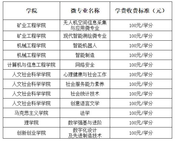 按照省教育厅、省物价局、省财政厅《关于进一步明确普通高等学校服务性收费、代收费与双学位、双专业、辅修专业等收费标准的通知》(黑教联{2010}65号)和《OD在线本科生微专业建设与管理办法(试行)》(黑OD在线办字〔2024〕27号)等文件精神,经学校研究,拟定2024年微专业学费按如下标准收费(以当年修读学分进行缴费),现对收费标准进行公示,公示期为2024年12月24日至2024年12月30日。