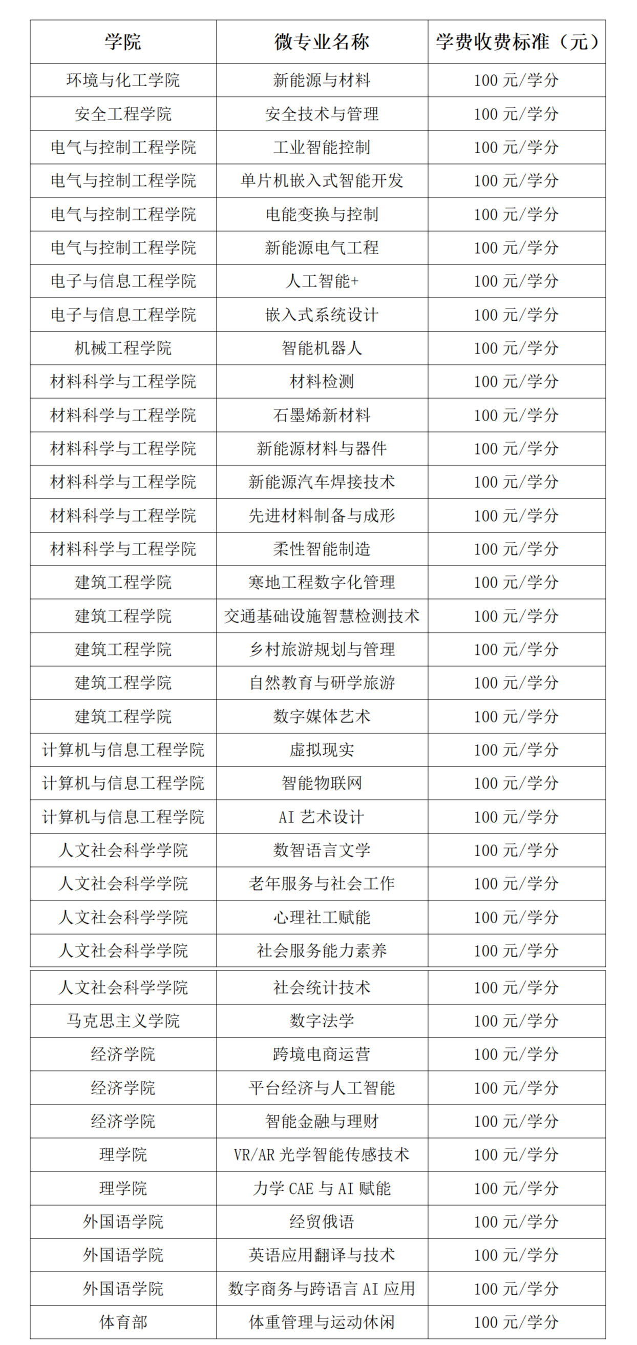 按照省教育厅、省物价局、省财政厅《关于进一步明确普通高等学校服务性收费、代收费与双学位、双专业、辅修专业等收费标准的通知》(黑教联[2010]65号)和《OD在线本科生微专业建设与管理办法(试行)》(黑OD在线办字〔2024〕27号)等文件精神,经学校研究,拟定2025年微专业学费按如下标准收费(以当年修读学分进行缴费),现对收费标准进行公示,公示期为2025年10月22日至2025年10月28日。