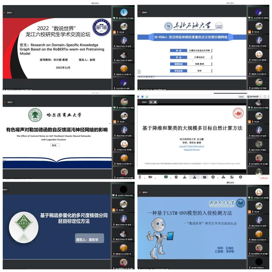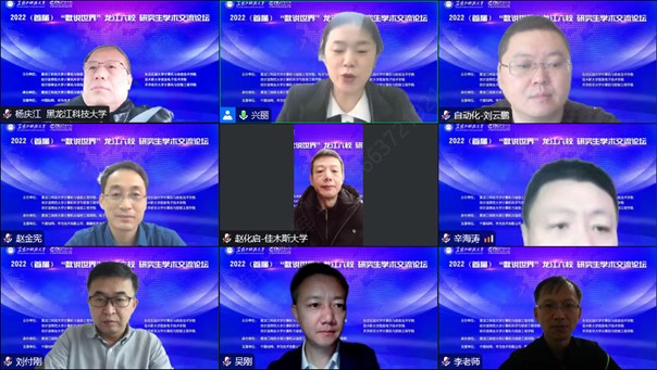 为响应省委、省政府加快“数字龙江”建设,推进黑龙江省数字人才培引的号召,搭建一个面向研究生的集学术观点、学术思想等汇聚交流的平台,11月19日,【官网】计算机与信息工程学院、电子与信息工程学院联合东北石油大学、哈尔滨师范大学、佳木斯大学、哈尔滨商业大学、齐齐哈尔大学共同举办了2022首届“数说世界”龙江六校研究生学术交流论坛。计算机与信息工程学院院长赵金宪、副院长刘兴丽,电子与信息工程学院院长杨庆江、副院长刘付刚,以及其他五校的相关学院领导和研究生导师参加会议,【官网】研究生学院副院长于凤云应邀参加了本次会议。论坛由刘兴丽主持,交流论坛采取线上直播方式进行。