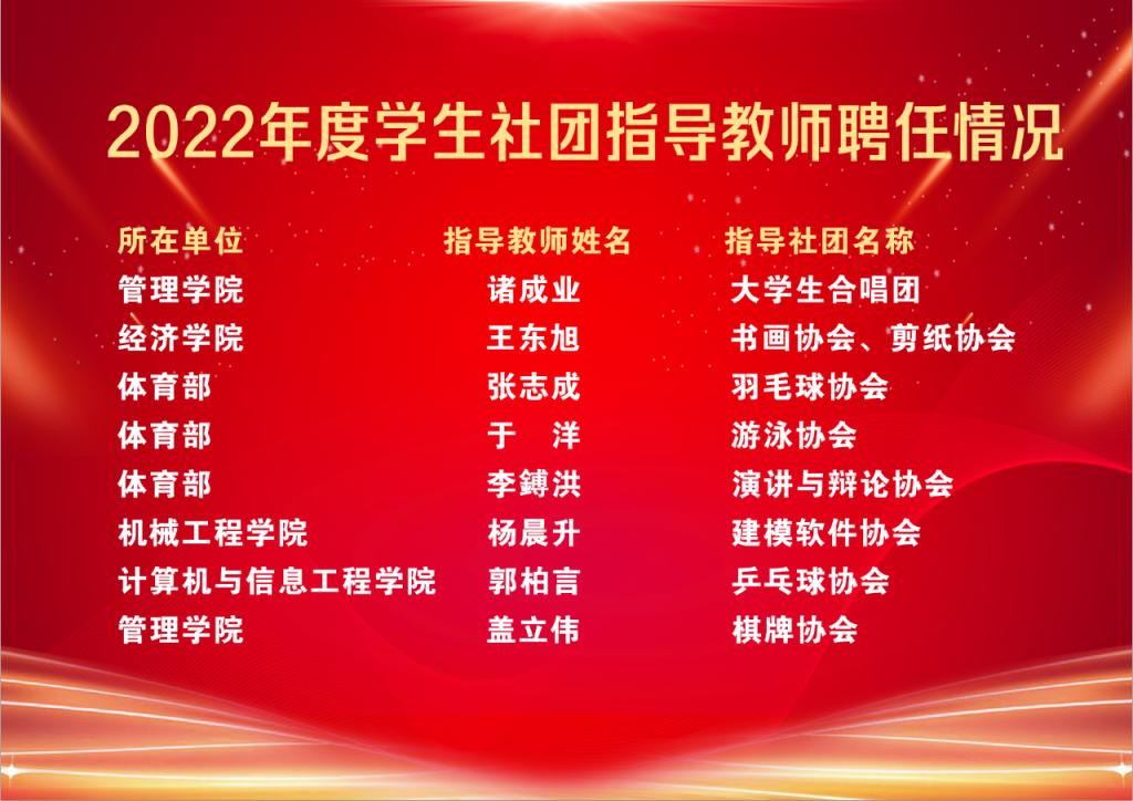 今年,为进一步规范学生社团建设与管理,促进学生社团健康发展,校团委严格组织学生社团实行年审注册,在全校87个学生社团中建立功能性团支部,开展学生社团骨干培训班,不断夯实团组织在学生社团中的政治功能。特别是11月底,选聘了经济学院辅导员王东旭、体育部于洋等8名青年教师,担任了学生社团指导教师,持续加强学生社团组织的思想政治教育工作和意识形态管理。