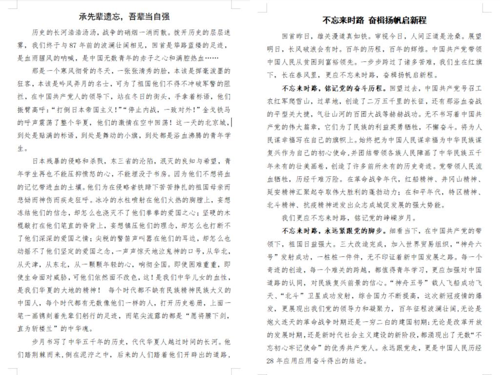 倾注爱国点墨,凝聚爱国赤诚。环化学子通过散文、记叙文、诗歌等不同文体格式,通过文字书写出当代青年对一二九运动乃至家国情怀的深入理解,在字里行间展示出一二九运动时期爱国志士对国民思想觉醒,民族团结,国家富强所做出的巨大贡献,也激励全体学生奋发进取、艰苦奋斗、有所作为。