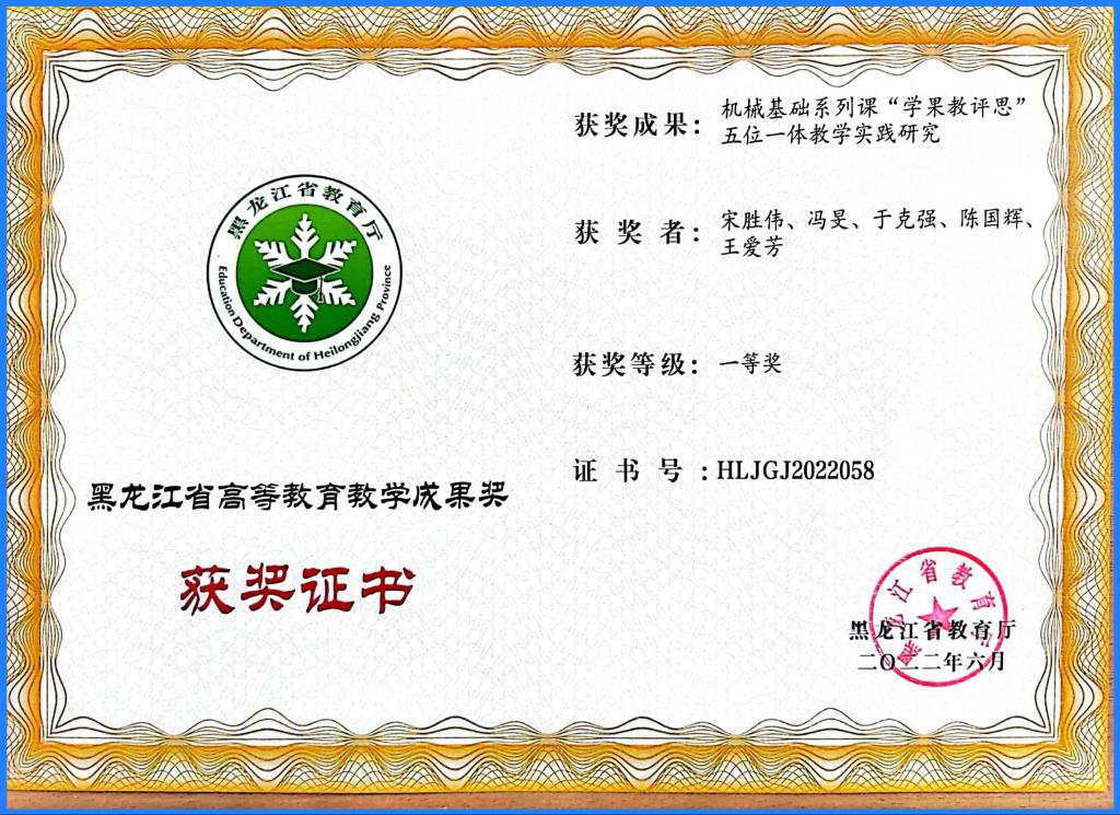 6月27日,黑龙江省教育厅公布了2022年黑龙江省高等教育和职业教育教学成果奖获奖名单,学院宋胜伟教授主持申报的“机械基础系列课‘学果教评思’五位一体教学实践研究”荣获一等奖。此次获奖也充分展示了学院近年来在课程建设、校企协同育人等教育教学改革方面取得的良好效果。