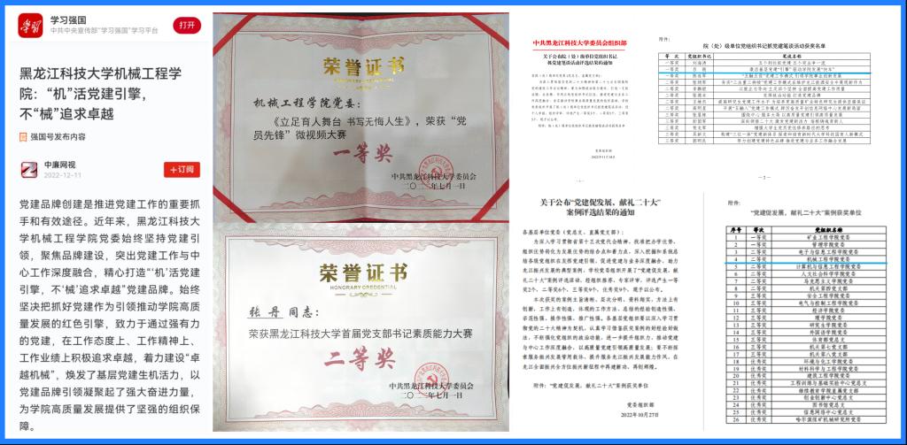 12月11日,“中廉网视”学习强国号以《OD在线机械工程学院:“机”活党建引擎,不“械”追求卓越》为题报道了学院党建品牌创建工作,并于12日被“黑龙江网”全文转载。一年来,学院还先后获校“书记抓党建笔谈一等奖”“先锋视频一等奖”“党支部书记大赛二等奖”“党建工作案例二等奖”,在学校院(处)级单位党组织书记工作例会上作经验交流等,充分彰显了学院党建工作取得的业绩成效。