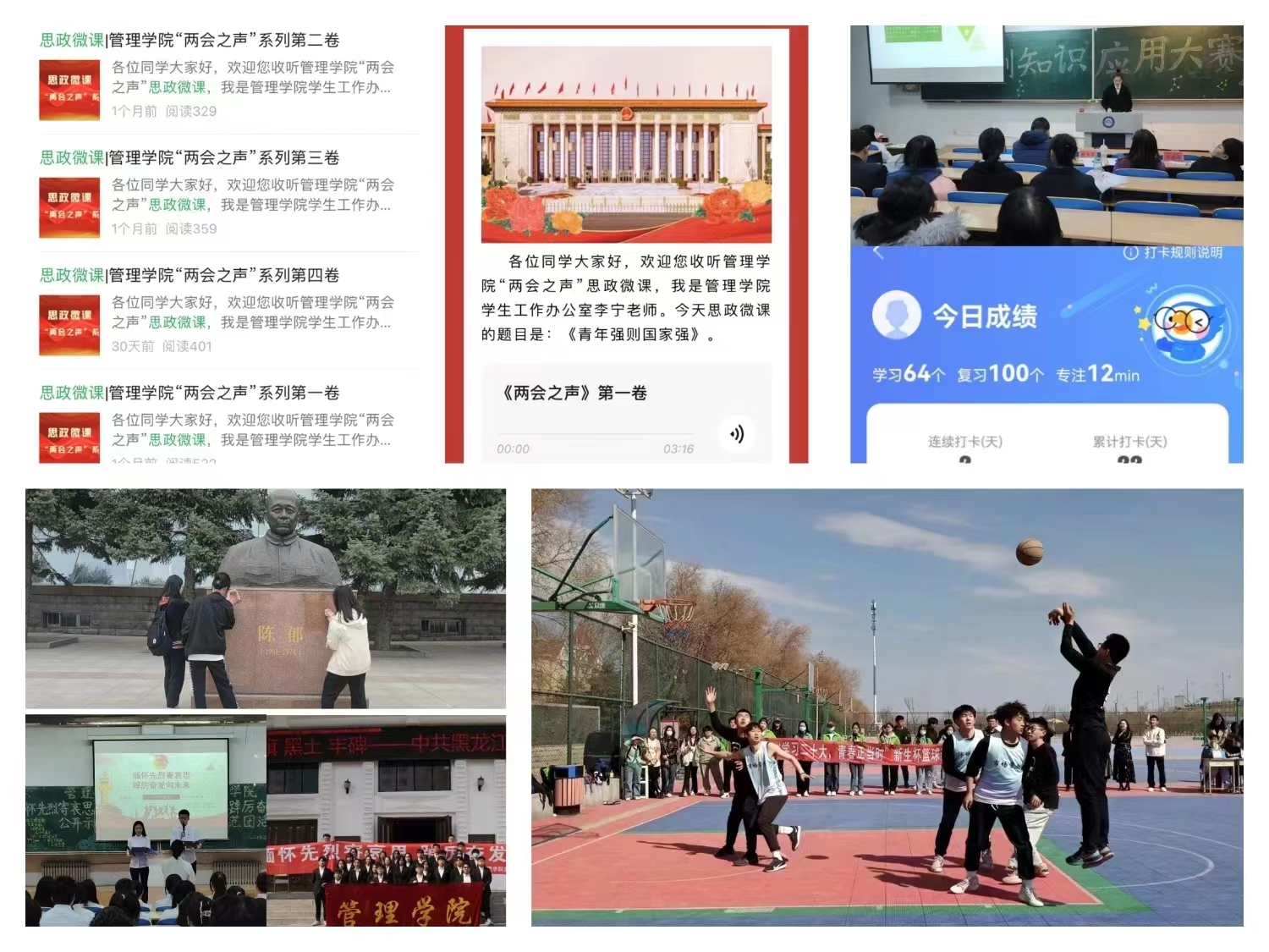 充实校园文化,以“活动”带学风。以思想性活动为核心,以学术性活动为重点,以文体性活动为载体,将学风建设落到实处。依托“管院之声”新媒体平台,学院全体辅导员老师为学生呈现了一堂堂高质量思政微课,引导管院学子自觉担负起时代赋予的使命担当;开展“缅怀先烈寄哀思,踔厉奋发向未来”爱国主义教育实践活动、“缅怀先烈志,共铸中华魂”志愿学雷锋活动,引导学生把崇高的理想信念和道德品质追求融入日常学习中,为实现中华民族伟大复兴的中国梦而努力奋斗;开展科创知识应用大赛、“你好四月”单词打卡活动,激发了学生们的科创热情,提升了创新思维能力,营造了良好的学术氛围,进一步推动学风建设;开展“学习二十大,青春正当时”为主题的“新生杯”三人篮球赛,培养了学生永不言败的意志品质,让学生在比赛中发展自我,增强体魄。