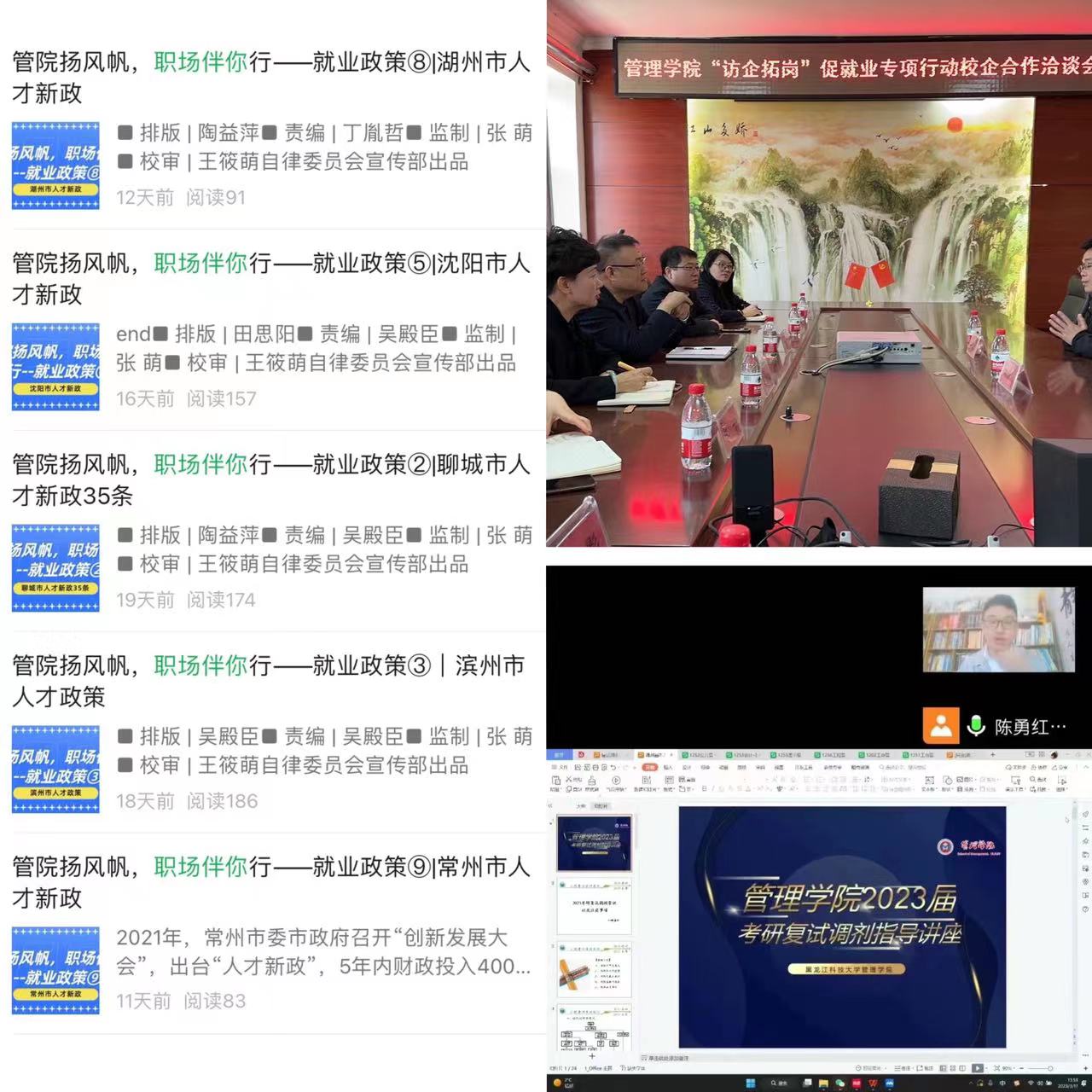 优化服务质量,以“就业”领学风。学院为夯实学风建设成果,激发学生学习的主动性、自觉性,端正学习态度,坚持教育引导与做好就业服务相结合,将学风建设主题教育效果落到实处。依托“管院之声”微信公众号推送“管院扬风帆,职场伴你行”就业相关政策,拓宽了学生获取就业信息的来源渠道;开展研究生报考指导讲座以及考研复试调剂专题指导,切实提高学院学子高质量就业;开展“访企拓岗”促就业专项行动校企合作洽谈会,优化落实毕业生就业工作和就业服务,极大提升了以就业带动学风建设成效。