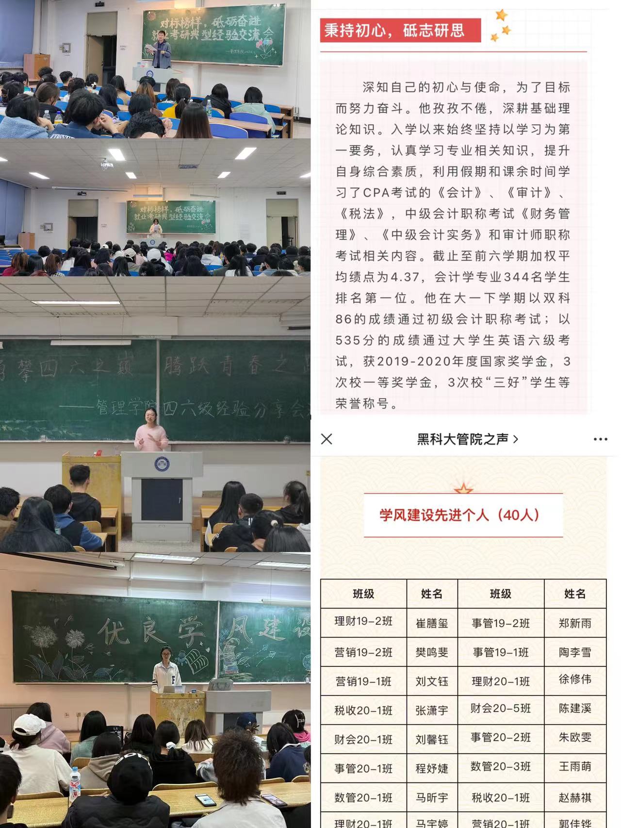 强化榜样力量,以“典型”促学风。理想信念是精神之钙,为向榜样学习,发扬榜样力量,管理学院大力选树一批先进个人典型,以榜样教育深化学风建设。通过“管院之声”微信公众号推文的形式,对榜样学生进行宣传,以学促学、以学比学,促进学生养成良好的学习习惯,在全院范围内营造比、学、赶、帮的良好学习氛围;开展“勇攀四六之巅,腾跃青春之路”四六级经验分享会以及“对标榜样,砥砺奋进”就业考研典型经验交流会,邀请四六级高分学生向同学们分享备考经验,保研、公考上岸、签约学子向同学们传授学习经验、求职技巧、考研准备等,引领学生落实职业规划,明晰发展方向,为加强学院学风建设奠定基础。