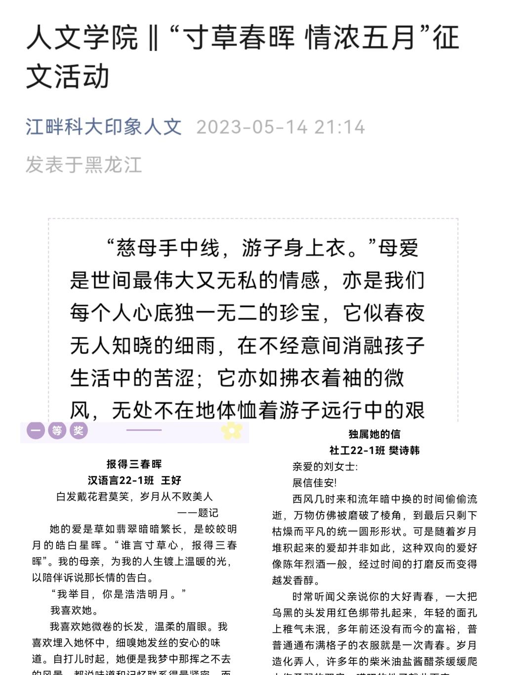 开展“寸草春晖,情浓五月” 征文活动。在本次活动中,同学们积极参与,踊跃投稿,书写着母亲的伟大与无私,表达了对母亲的赞美与颂扬,展现了对母亲与母爱的理解与感悟。不仅让同学们在思考中感受母亲的良苦用心,而且进一步地引导学生以实际行动表达对母亲的爱意。