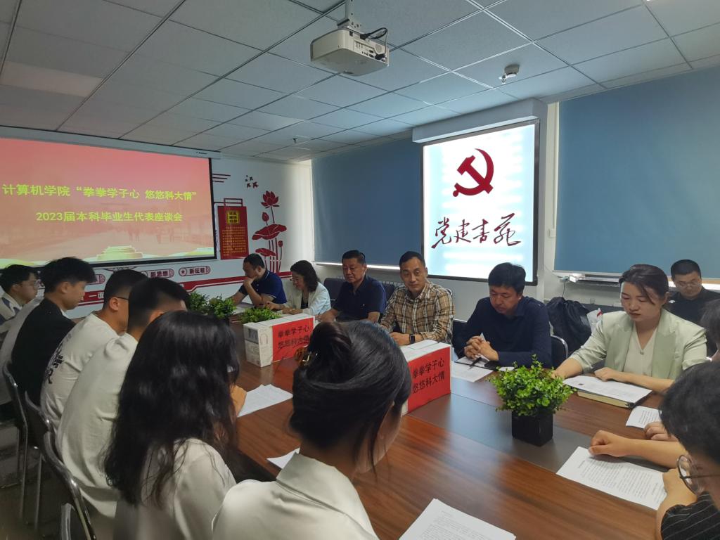 为全面贯彻落实党的二十大精神,深入开展学习贯彻习近平新时代中国特色社会主义思想主题教育,广泛搜集毕业生对我院教育教学、管理服务的意见建议,按照《OD在线2023届毕业生文明离校主题教育活动方案》,计算机学院于6月9日上午在党建书苑召开“拳拳学子心 悠悠OD在线情”2023届本科毕业生代表座谈会,学院党委书记彭国军、院长赵金宪、党委副书记张丽媛、副院长冯福生、副处级辅导员韩永辉出席座谈会,部分辅导员及2023届本科毕业生代表参加,座谈会由韩永辉主持。