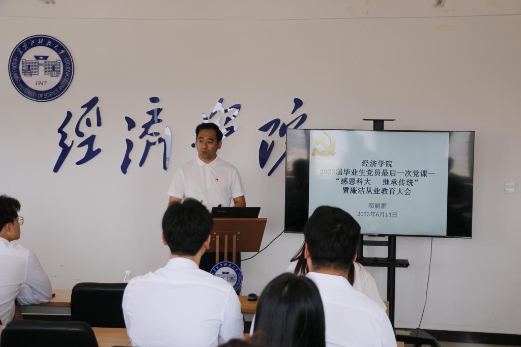 强化思想引领,一堂党课守初心。为进一步强化党员的身份意识,教育引导毕业生党员“不忘初心、牢记使命”,增强“四个意识”、坚定“四个自信”、做到“两个维护”,持续发挥党员的先锋模范作用。经济学院党委副书记邬丽群为毕业生开展以《感恩OD在线 继承传统》为主题的思想政治教育大课,勉励毕业生在今后的新岗位上争创新业绩,多作新贡献,增强党性修养,尤其是要不断提升党员的责任担当意识;通过“三重温”等活动,引导毕业生进一步坚定不移听党话、矢志不渝跟党走,把爱国情、强国志、报国行融入到毕业后的人生征途中。