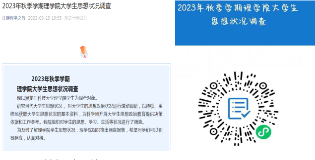 三是做好大学生思想状况调查。学院利用微信公众号设计调查问卷,对全体大学生进行了思想状况调查,鼓励同学通过调查问卷真实的表达自己的感受和诉求。通过问卷调查,更加清楚地了解学生的思想动态和各项诉求,联系学校相关部门有效解决学生的问题,更加优速快捷地为学生服务。