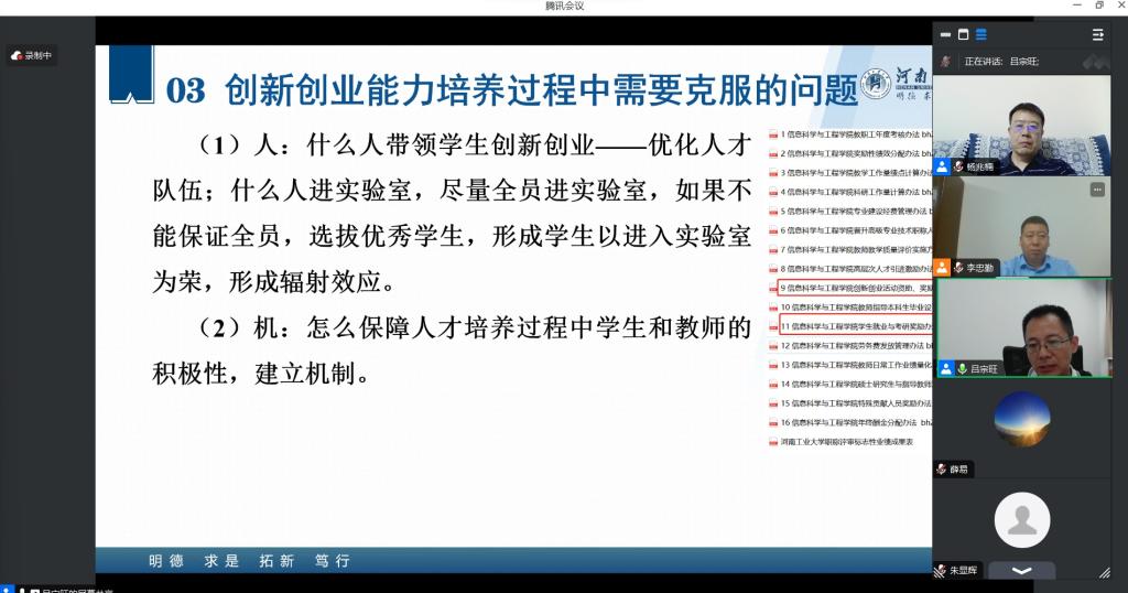 为了提升【官网】大学生创新创业能力,提高教师指导大学生创新创业项目的工作成效,9月21日,创新创业学院与电气与控制工程学院共同邀请河南工业大学吕宗旺教授通过线上的形式做了关于“提升大学生创新创业能力的培养策略”的交流报告。报告从创新人才培养面临的问题出发,提出了从“人、机、物、法”四个方面破解问题的方法,并通过亲身实践的详实案例和做法为大家展示了如何培养创新型人才的路径,为【官网】教师提供了良好的借鉴和启发。最后与会教师关于创新实验班和创新实验室建设方面与吕教授进行了深入交流。