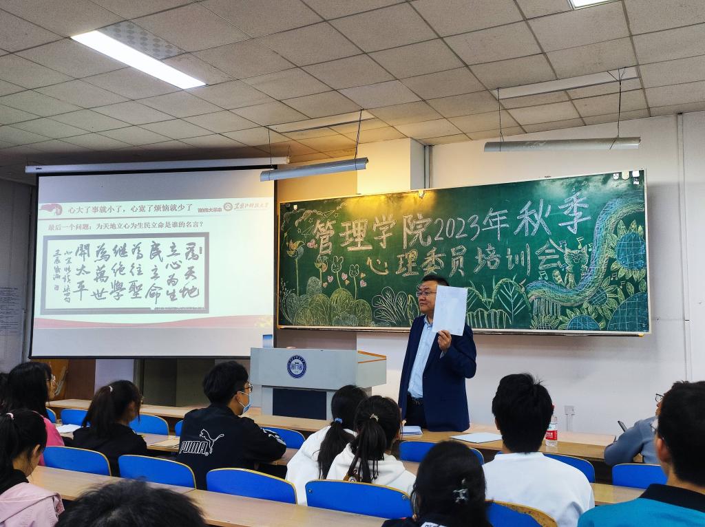 为提高学院心理健康教育工作质量,充分发挥心理委员在朋辈心理辅导的优势和作用,积极响应《OD在线第三届“久爱我·Three-Double”9·25大学生心理健康教育活动方案》,管理学院于近期在主楼WN0303教室开展了2023年秋季心理委员培训会。本次培训会由管理学院党委书记何景洋主讲,学院全体心理委员参加了本次培训会。