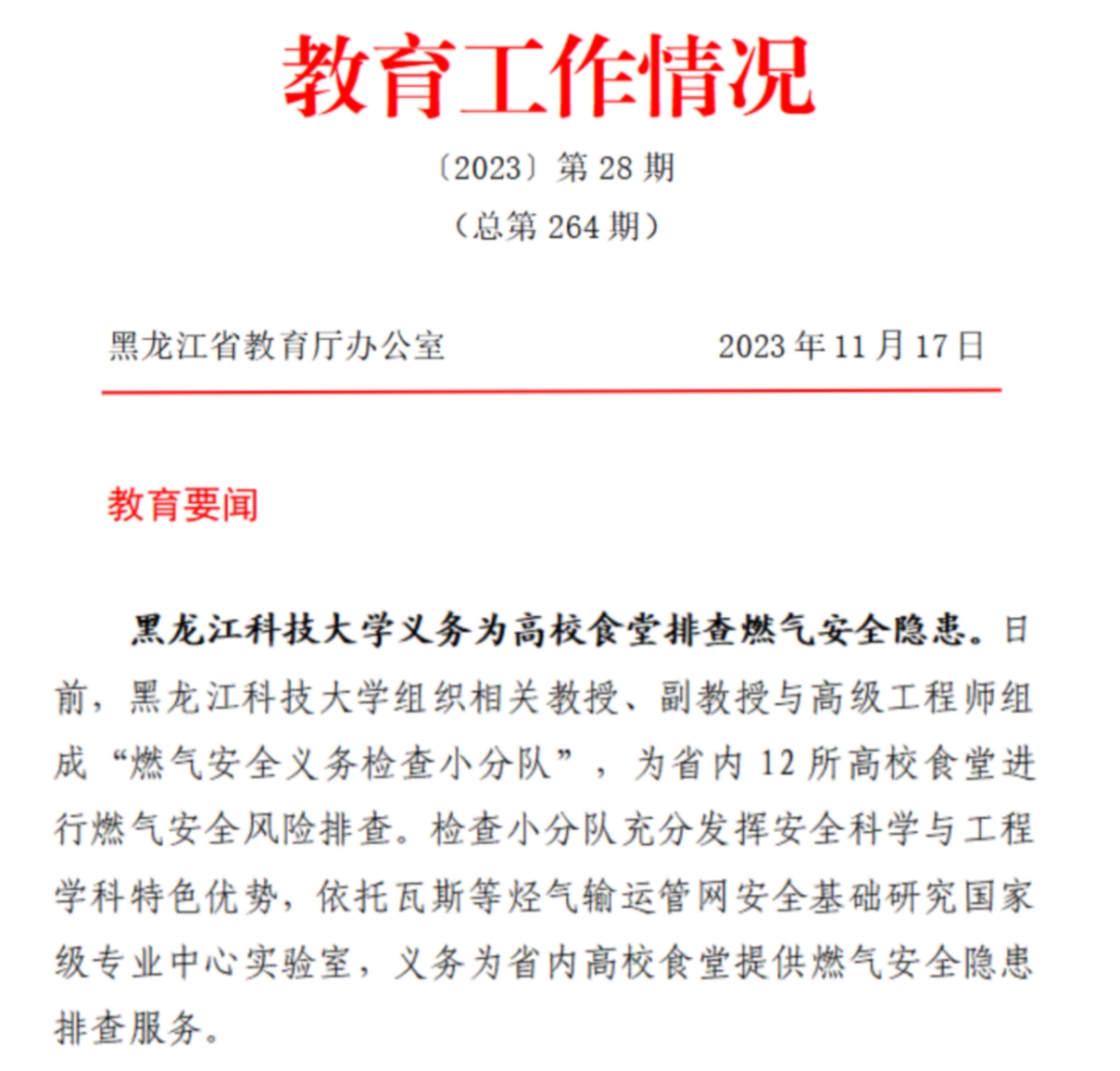 9月至10月,学院发挥学科专业优势,组建了一支由1名教授、6名副教授、2名高级工程师组成的“燃气安全义务检查小分队”,为在哈12所高校开展了校园燃气安全检查,助力兄弟高校筑牢燃气“安全墙”,守好师生“生命线”。