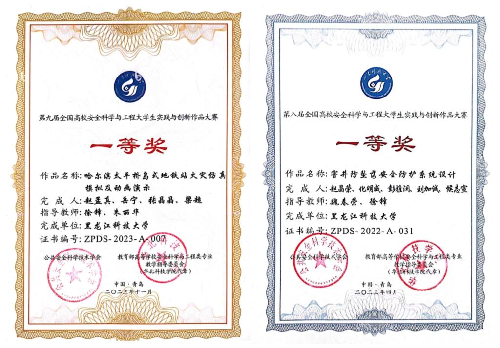 2019级本科生赵晶荣、2020级本科生赵孟真在全国安全科学与工程类大学生实践与创新作品大赛中分别获一等奖。此外,学院在“崇劳杯”第十届安全卫生应急知识竞赛中获得团队对抗赛一等奖1项、三等奖1项,展现了学生创新能力培养持续提升。