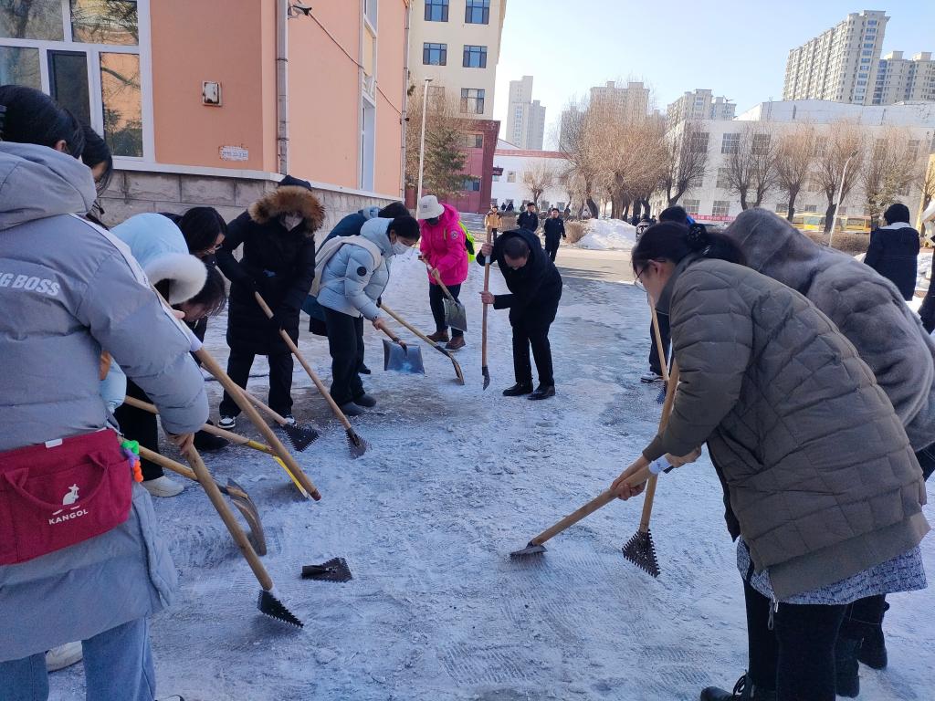 行动是最好的融雪剂,全体党员积极响应,以动制“冻”,迎寒而上,干劲十足,铁锹、三角铲、扫把等清扫工具轮番上阵,铲冰雪的摩擦声不绝于耳,忙中有序的身影成为校园里一道靓丽的风景线。经过大家的共同努力,路面被清扫的干干净净,保障了师生出行安全。