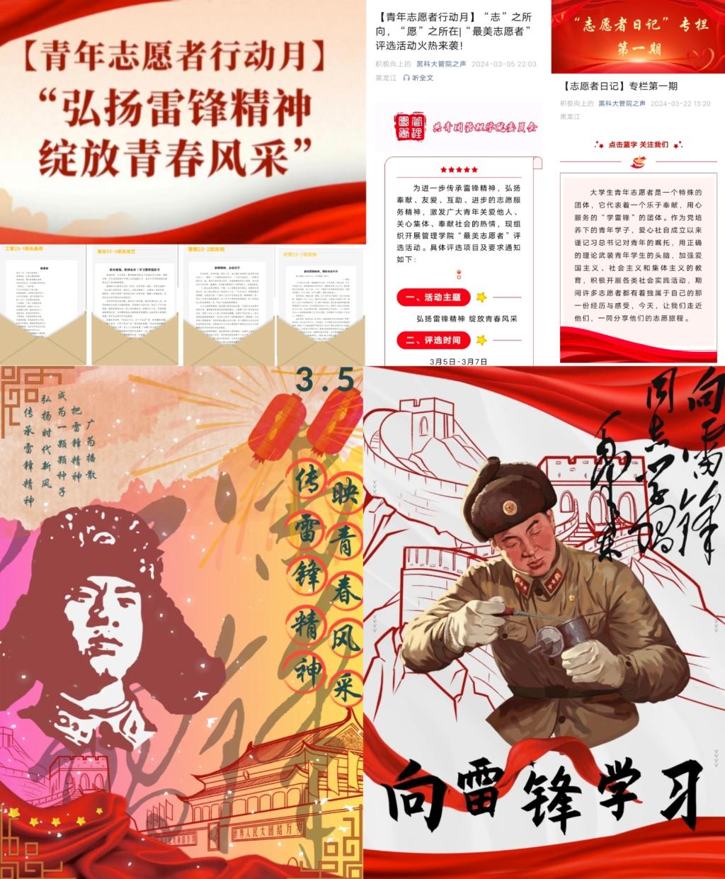 奏响奋斗之曲,在广泛宣传中强化实践成果。管理学院开展了“志之所向 愿之所在”最美志愿者评选活动,推出“志愿者日记”系列专栏,充分发挥榜样示范作用。组织全院青年学生进行青年志愿者注册工作,达到团员青年全覆盖。举办“弘扬雷锋精神 绽放青春风采”主题征文活动、“传雷锋精神 映青春风采”海报征集活动,青年学生用文字讲述了暖春三月颂雷锋,用画笔勾勒出心中英雄形象,在字里行间中进一步弘扬雷锋精神,在款款深情中书写新时代雷锋故事。
