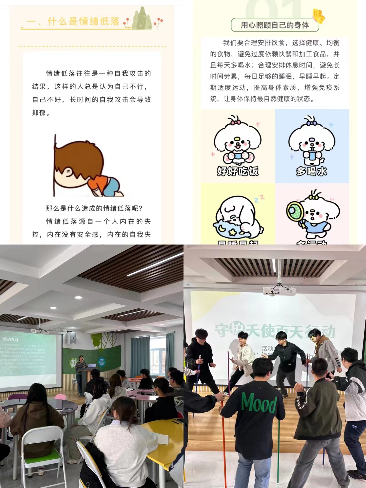 心灯相传,智慧领航,筑牢心灵防线。学院通过新媒体公众平台持续推送心理健康知识,扩大心理健康教育辐射范围,进一步为学生普及心理健康知识,提升学生对自身心理健康的重视程度。4月18日开展心理委员及寝室联络员团体辅导技能培训会,提升心理委员和寝室联络员的工作技能和责任意识,加强我院心理朋辈队伍建设,帮助心理委员和寝室联络员更好地发挥在大学生心理健康教育工作中的重要作用,为后续的“守护天使百天行动”团体辅导活动的开展打下坚实的基础。