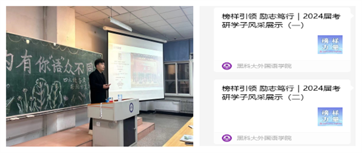 树立榜样,示范引领。为了进一步发挥优秀同学的榜样作用,切实满足同学们在英语学习过程中的需求,系统地备考大学英语四六级考试,外国语学院开展“英”为有你“语”众不同—大学英语四六级考试备考经验分享会。针对性地解决同学们在英语学习过程中的问题,让同学们的学习与备考更加地科学、合理、高效。同时,外国语学院公众号开展考研学子风采展示活动,树立榜样力量,引导广大同学向榜样看齐,明确学习目标,不断地提升自己,努力向榜样靠近。外国语学院通过榜样教育系列活动,使更多的外院青年学子能够积蓄力量、提升素质、增强本领,肩负起民族复兴的伟大使命。