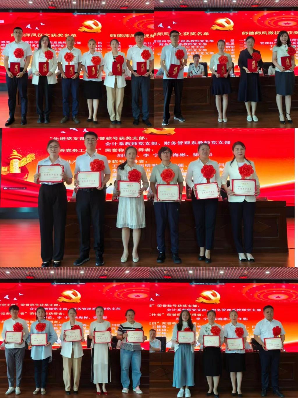 大会在雄壮的《国歌》中拉开帷幕。会上,院长洪亮宣读了关于表彰先进党支部、优秀党务工作者和优秀共产党员的决定,副院长高太光宣读了关于表彰师德师风主题征文和“教师风采”微视频的决定。与会领导为受表彰代表颁发了证书。优秀党务工作者代表、学生第十一党支部书记李宁,优秀共产党员代表、市场营销系主任田雪莲、会计系冯露及团委副书记王鹤怡分别作了交流发言。