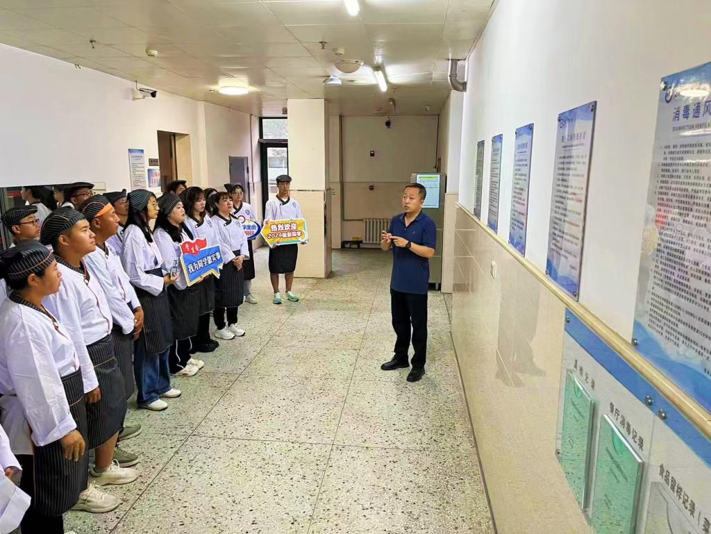 新生家长和学生代表更换工作服后,在工作人员的引领下逐一参观了食材库房、米饭生产线、主食间、粗加工间、切配间、烹饪间、售饭区、洗消间和明厨亮灶视频监控系统。工作人员对食堂原料采购、食品贮存、生产加工、食品留样、清洗消毒、餐厨废弃物处置、有害生物防治、员工管理等方面的工作流程和食品安全控制措施进行了详细介绍。