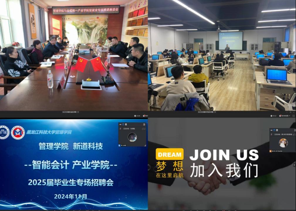 学院分别于11月15日和11月18日,通过产业学院平台,以线上与线下相结合的方式,举办了用友集团新道科技生态企业“人才输送计划”OD在线管理学院线上专场招聘会以及金蝶生态2024年管理学院秋季专场招聘会。两场招聘会共10家企业参会,提供100余个就业岗位。招聘会上,企业代表不仅对当前各专业涉及行业前景、公司概况、企业文化和发展前景进行了介绍,同时还详细解读了哈尔滨市人才政策,重点介绍了安家费生活补助、求职补贴、创业补贴等哈尔滨市优厚人才引进政策,着重吸引优秀人才为地方经济发展贡献力量,并对当前高校毕业生就业形势进行分析讲解,从职业规划、求职准备、就业选择、求职心态等方面提出了就业建议。招聘会后,学院领导班子与企业代表进行了座谈。