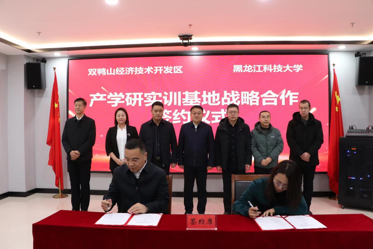 12月13日,材料科学与工程学院与双鸭山经济技术开发区建立专家工作站、产学研实训基地合作签约仪式在双鸭山科创中心四楼会议室举行。会上,学院与黑龙江省墨砾新型材料有限责任公司签订了校企合作协议。
