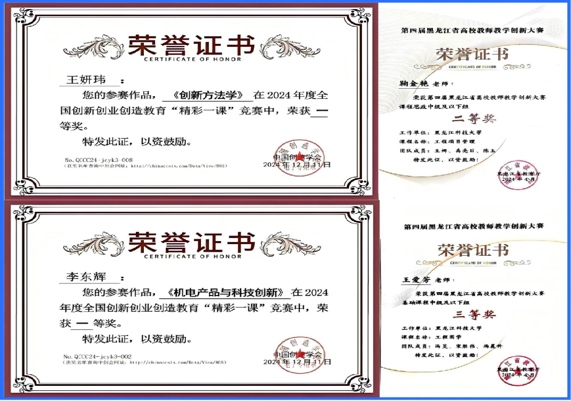 4月26日,在黑龙江省第四届教学创新大赛中,鞠金艳、王爱芳分别获得二等奖、三等奖;11月23日,在全国创新创业创造教育“精彩一课”竞赛中,王妍玮、李东辉均获得一等奖;12月17日,在学校第五届教学创新大赛中,曲芳、于海滨、李录彬均获得一等奖。