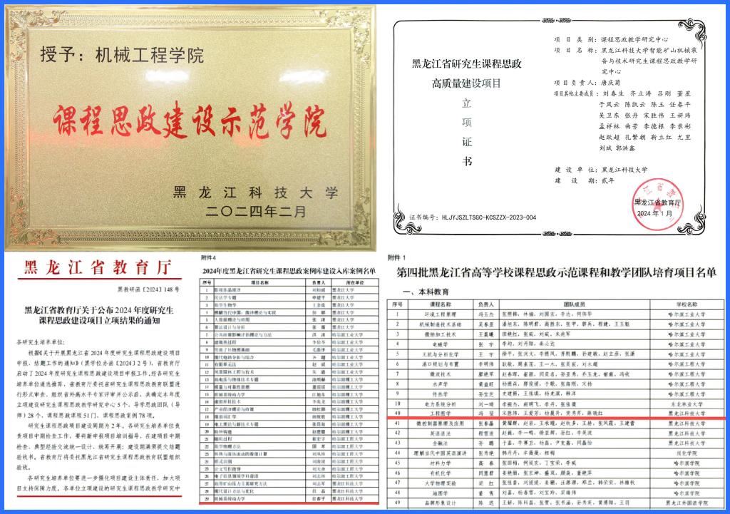 全年课程思政建设捷报频传:除获批“黑龙江省研究生课程思政教学研究中心”外,还获学校“课程思政建设示范学院”;《工程图学》课程获批“省高等学校课程思政示范课程和教学团队”;《机械系统动力学》课程获批“省研究生课程思政建设项目课程思政案例”;《机械制造工程学》课程思政优秀案例在“新华网新华思政”平台进行展播;还有2门课程和2个案例获批校级课程思政示范课程和教学团队及课程思政优秀教学案例。
