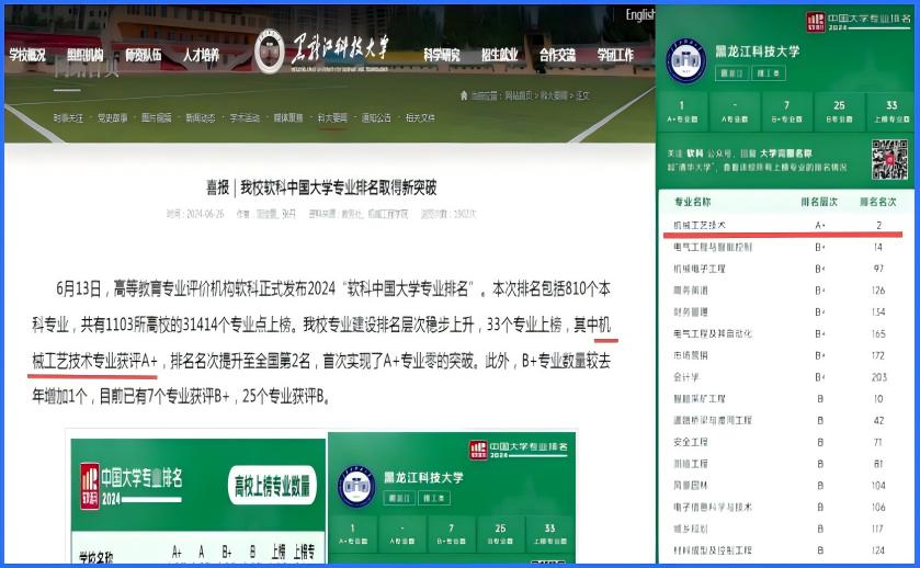 6月13日,高等教育专业评价机构“软科”正式发布“2024软科中国大学专业排名”。机械工艺技术专业获评A+,排名名次提升至全国第2名,并首次实现了学校A+专业零的突破。软科中国大学专业排名指标体系设置学校条件、学科支撑、专业生源、专业就业、专业条件5个指标类别,共25项测量指标。共有1103所高校的31414个专业点上榜。