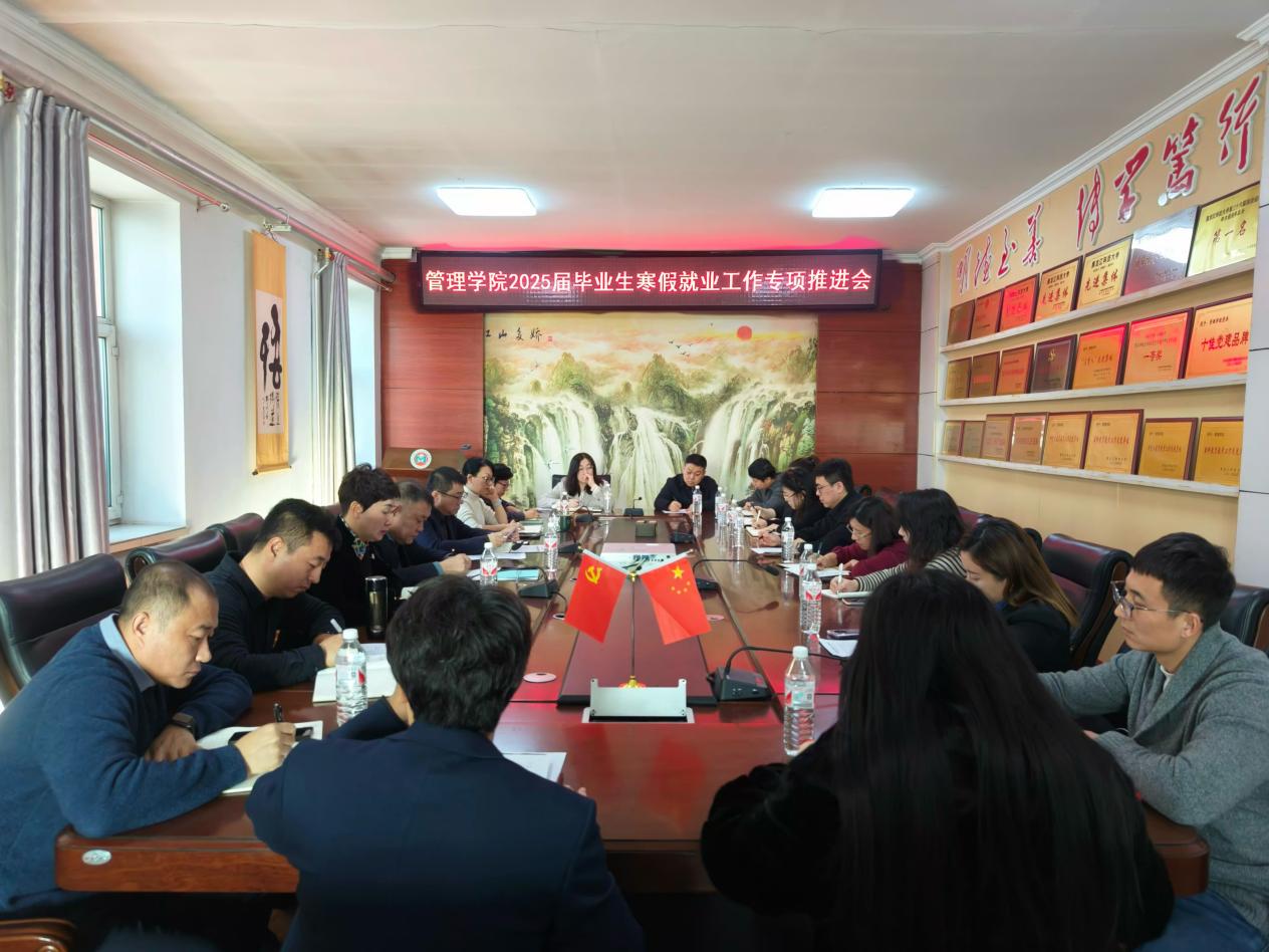 为全面落实2025届全省高校毕业生就业工作第二次推进会议精神及寒假窗口期就业服务不断线的工作要求,12月27日,管理学院召开2025届毕业生寒假就业工作专项推进会。学院领导班子、各系主任、党支部书记及学工办全体辅导员参加了本次会议,会议由学院党委副书记徐海英主持。