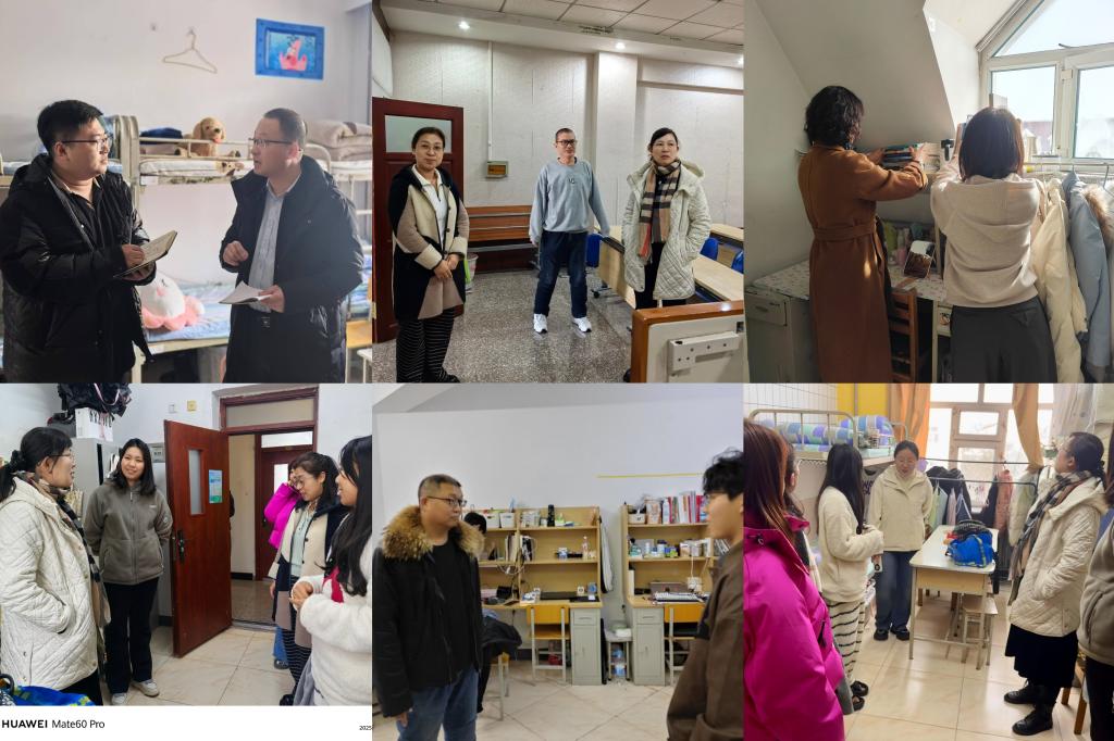 “稳”中求进,做到安全检查到位。为认真贯彻落实《关于做好2025年春季开学校园安全工作的通知》要求,学院坚持把安全工作放在首位,压紧压实安全工作责任制,领导班子成员分头行动,先后深入到综合实训室、教研室、学生社区开展卫生状况及安全隐患检查,指出问题不足,提出改进建议,并与师生们亲切交谈送去组织的温暖关怀。同时,叮嘱大家要以“时时放心不下”的责任感、“事事心中有底”的执行力、“处处用心用力”的精气神做好安全工作,确保校园安全稳定。