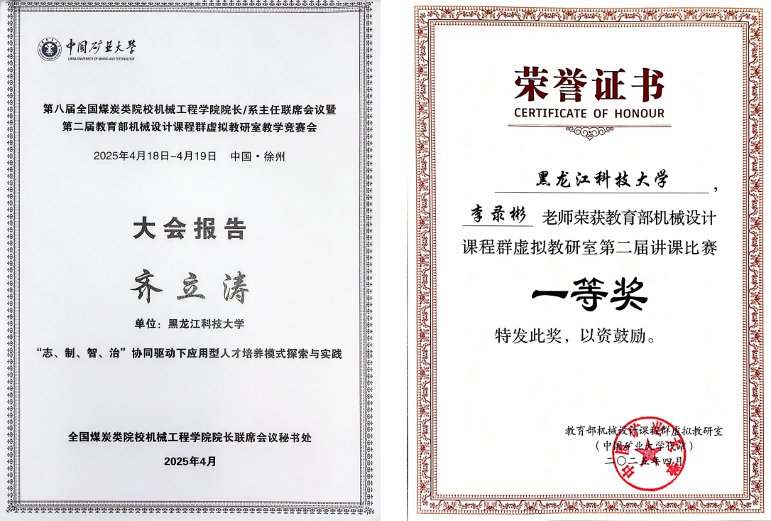 4月19日,在第八届全国煤炭类院校机械工程学院院长/系主任联席会议上,齐立涛教授做了机械类应用型人才培养模式探索与实践的大会报告。机械工程学院机械制造教研室李录彬老师荣获教育部机械设计课程群虚拟教研室第二届讲课比赛一等奖。
