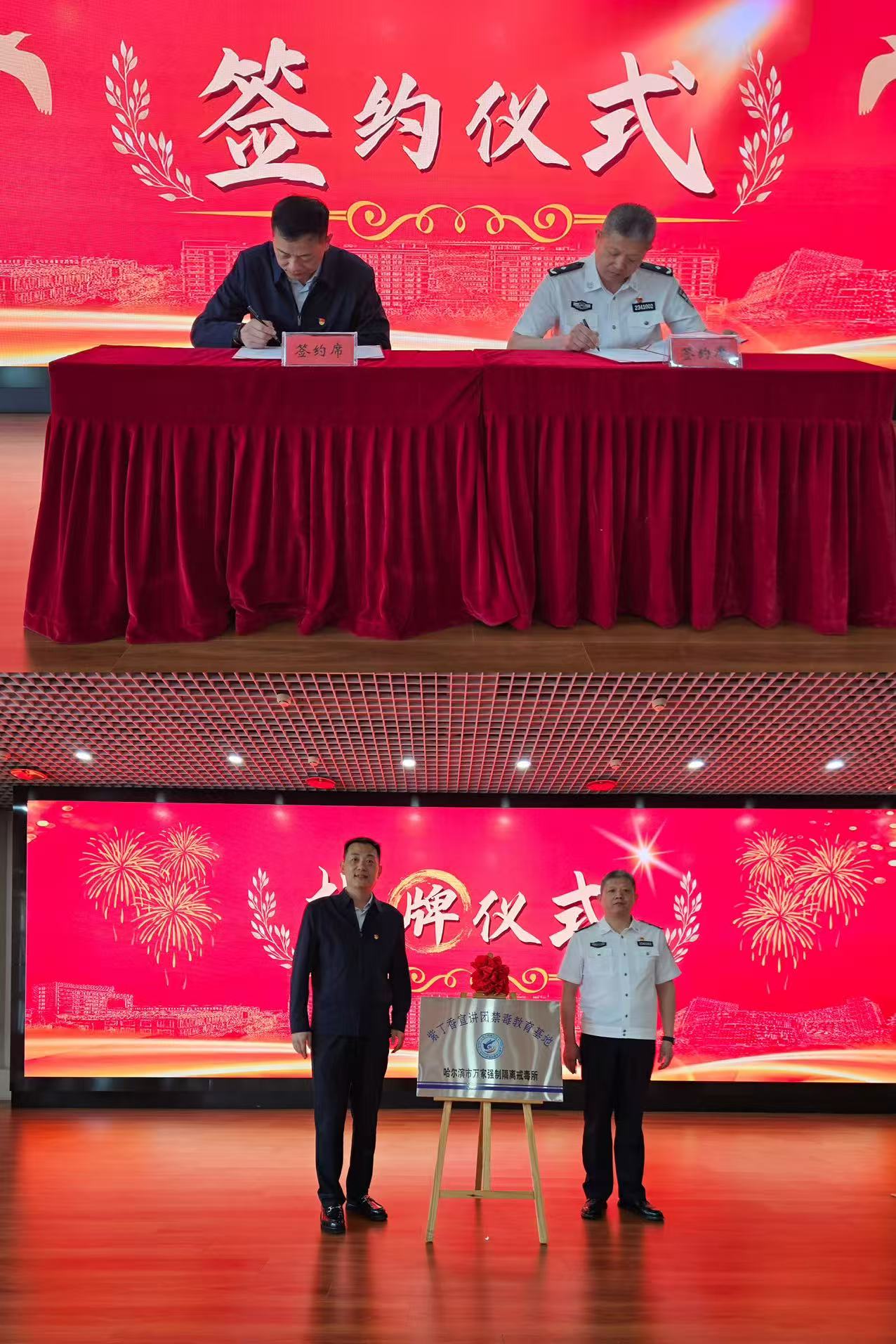 为深入贯彻落实党中央关于加强高校党的建设重要部署,不断强化党组织的政治功能和组织功能,推进校警协同联动机制建设提质增效,5月28日上午,【官网】研究生学院与哈尔滨市万家强制隔离戒毒所党建结对共建签约仪式在朝阳楼0131会议室举行。研究生学院党委副书记王伟强、副院长党振乾;哈尔滨市万家强制隔离戒毒所党委副书记、政委姜海滨,党委委员、副所长敖平及党员干警;研究生学院辅导员、百余名同学参加了签约仪式。