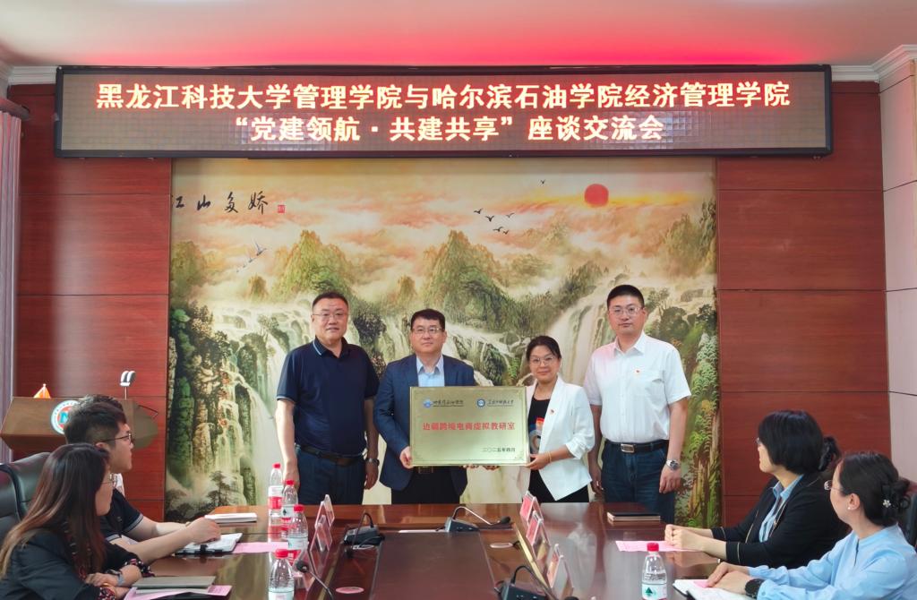 6月6日下午,哈尔滨石油学院经济管理学院党总支书记宋旭、院长任洪云等一行10人来【官网】管理学院开展“党建领航·共建共享”座谈交流。管理学院党委书记何景洋、院长洪亮、党委副书记徐海英、副院长张倩、副院长高太光、教务办公室主任肖昆、市场营销系主任田雪莲参加座谈会。“东北亚跨境电商产业学院”共建单位——黑龙江俄速通集智科技有限公司副总经理都宪宇、项目经理姜松岩应邀出席座谈会。