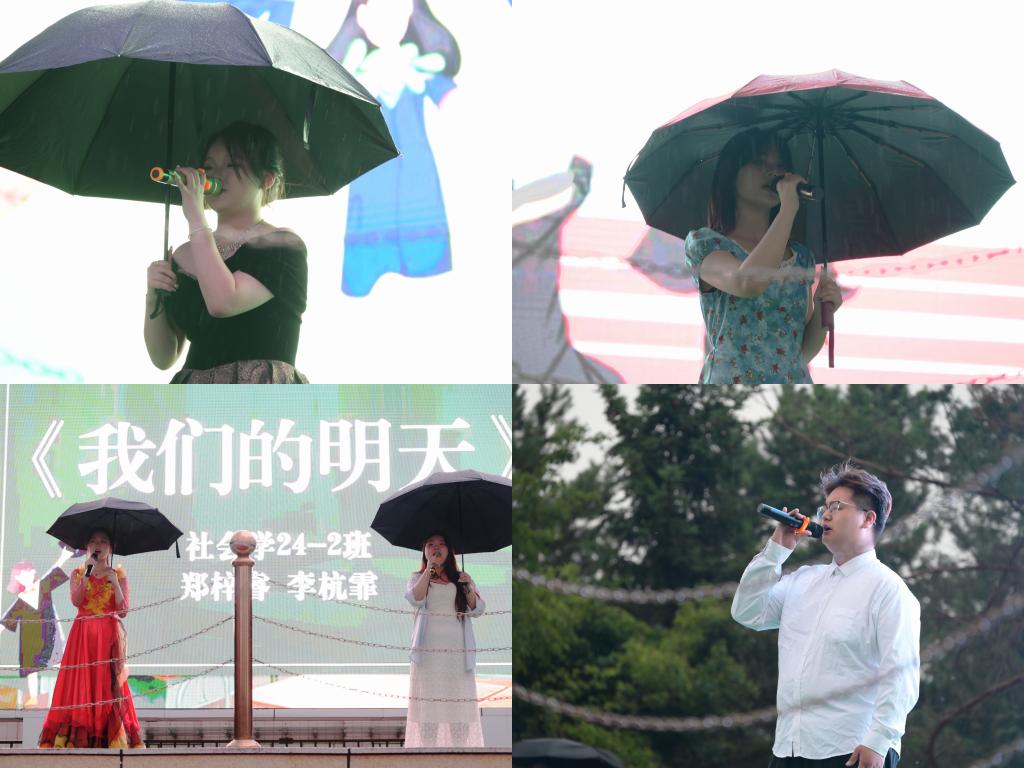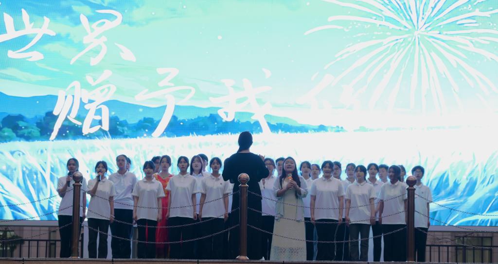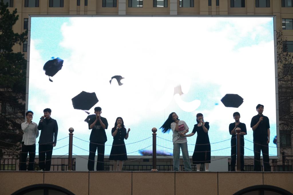 第三篇章“征途向新•梦想启航”以合唱《世界赠予我的》开篇。表演者以温润绵长的声线,层层递进地铺展三重情感画卷,抒发对母校培育之恩、师生情谊以及未来征程的诚挚礼赞。歌声中,既有对昔日的彷徨与不舍及临别之际的惆怅思绪,更包含对未来的坚定信念与热切憧憬;晚会尾声,毕业生辅导员与毕业生代表联袂献唱经典曲目《再见》,将整场晚会的氛围推向最高潮。当熟悉的旋律响起,台下观众自发进行合唱,每一个音符都震颤着青春记忆的共鸣。辅导员们以温润声线传递临别叮嘱,音符间饱含“前程似锦”的殷切期许;毕业生们则用歌声勾勒大学时光的剪影,千言万语化作哽咽的旋律。这一刻,舞台上下情感交融,泪水与笑容相应,此刻被永远定格在2025年夏夜的毕业纪念册中。